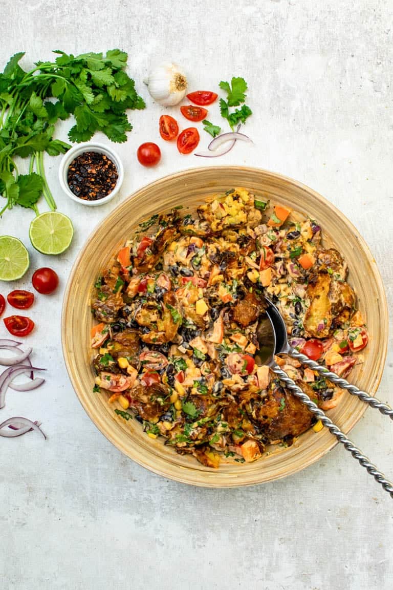 This smashed crispy potato salad is a bold, flavour-packed twist on the classic. Golden, jagged potatoes meet a smoky chipotle mayo, tossed with black beans, sweetcorn, cherry tomatoes, and plenty of fresh herbs. Warm, hearty, and totally irresistible, it’s comfort food with serious attitude.
