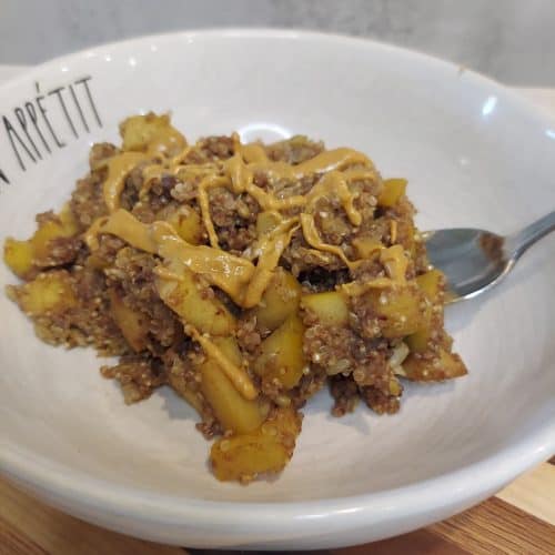 This baked apple cinnamon quinoa is one of those recipes that works for any meal of the day. The quinoa bakes up creamy and tender while the diced apples soften into warm, cinnamon-spiced bites throughout. Top it with melted peanut butter and sunflower seeds, and you’ve got a filling, high-protein bowl that takes almost no effort to put together.