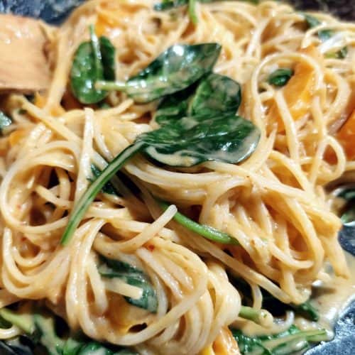 These creamy vegan coconut curry noodles come together in one pan in about 15 minutes, and the result is a rich, saucy bowl of rice noodles swimming in a spiced coconut broth with tender bell pepper and wilted spinach. I originally got this recipe from MealThinker, the AI meal planning app I use to come up with all my recipes now. I tell it what I’m in the mood for, it generates something tailored, and this one was an instant winner.