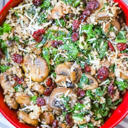 Freezer: This bowl freezes well for up to 2 months. The kale and mushrooms soften slightly after thawing, but the grains and overall flavor hold up. Thaw overnight in the fridge before reheating.